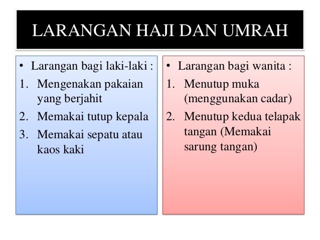 Bahkan larangan ini juga berlaku saat ada laki-laki yang berada di sekitarnya. Bagi seseorang yang sedang melakukan ibadah haji ataupun umrah tentulah ada larangan-larangan tersendiri yang harus dijauhi dan ditinggalkan. Larangan hajiumrah ada yang berlaku khusus untuk laki-laki ada yang khusus untuk perempuan dan ada yang berlaku untuk keduanya.